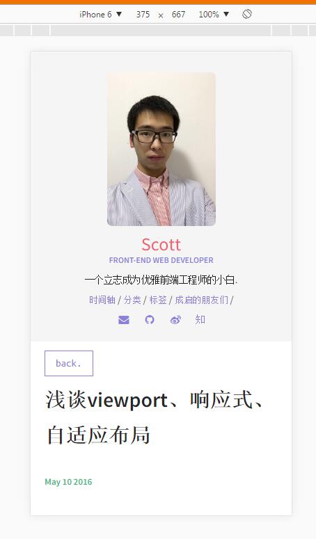 由于屏幕过小,所以我们在这种情况下将左侧侧边栏移动到顶部,宽度设置为100%,同样的将右侧的内容宽度设置为100%,然后在页面滚动的情况下,我们将内容覆盖在信息之上。