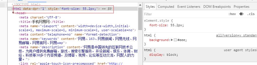接下来我们以网易移动端为例,在iphone6plus下它将html根字体大小设置为55.2px,设置了dpr=1应该是对dpr没有任何的考虑,然后随便找一处页面中的内容查看元素: