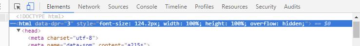 在iphone6plus设备下,我们看到html根字体为124.2px这么一个奇葩的数字,而且还有一个data-dpr=3,到底是什么意思呢?跟我的思路往下看: