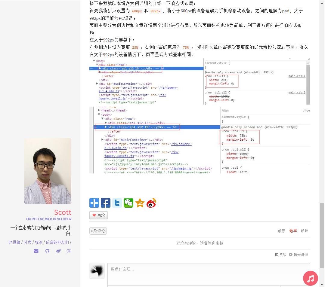 左侧侧边栏设为宽度25%,右侧内容的宽度为75%,同时将文章内容等受宽度影响的元素设为流式布局,所以在大于992px的设备情况下,页面呈现方式基本相同。
