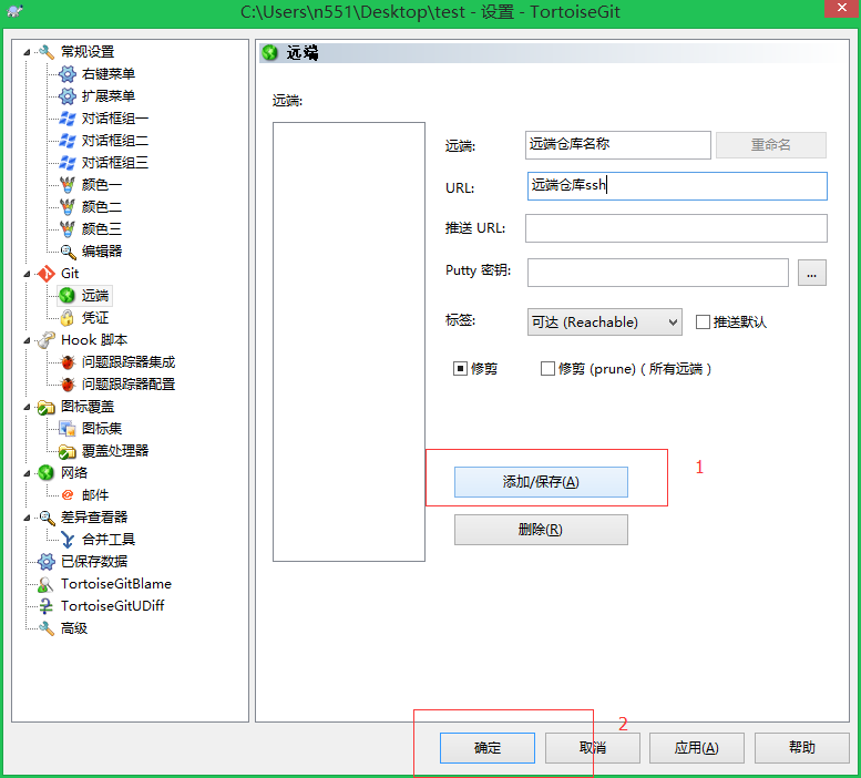 在拉取的过程中我们并没有提供远程数据库,所以此界面中没有可供选择的origin,接下来我们要先设置好远程仓库再返回来接着进行pull操作,分别填入远程仓库的名称和地址,然后点击保存再点击确定,这样在pull和push的时候就会有一个可选项:
