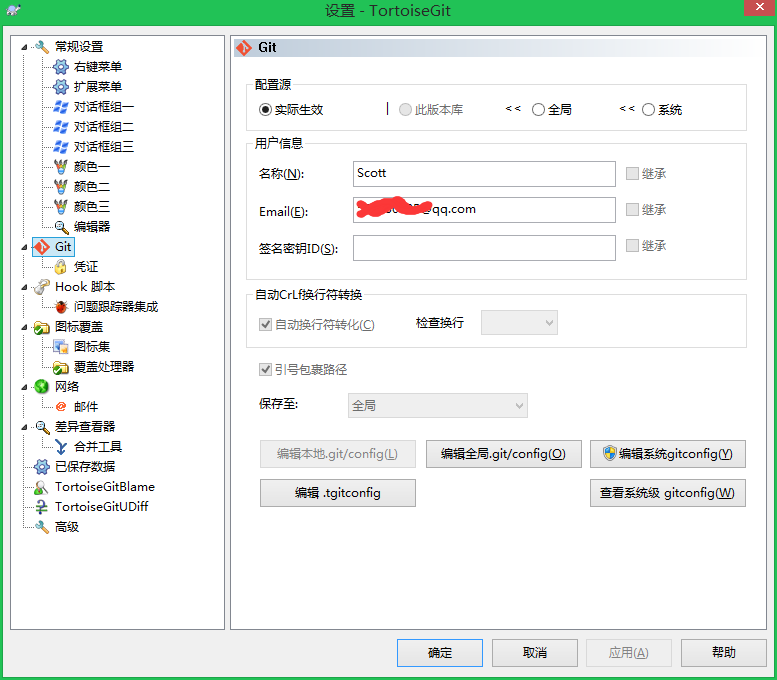 选择好要放置本地数据库的路径并进入为当前路径,之后在该窗口下点击右键,选择到设置信息项,在窗口中点击Git项,配置名称和Email,它将用于代表以后你的身份信息: