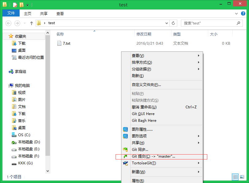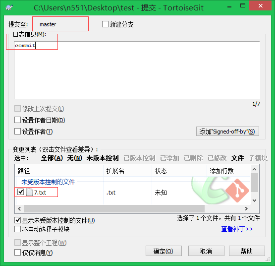 在TortoiseGit当中,它帮助我们合并了add和commit的操作,所以我们直接新建一个文件测试commit操作,此时我们选中提交的文件和提交到哪个分支并填写提交的信息以确保以后工作中的代码回溯需要: